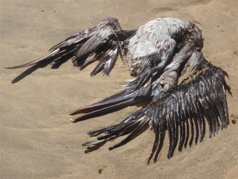 While this nearby dead pelican had no choice in the matter.